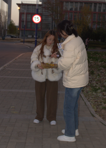 同学们俯身探寻落叶之美
